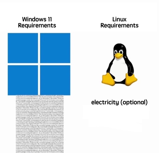 arrow-up1887arrow-down1imageRequirementslemmy.mlcm0002@lemmy.world to linuxmemes@lemmy.world · 8 months agomessage-square78linkfedilink