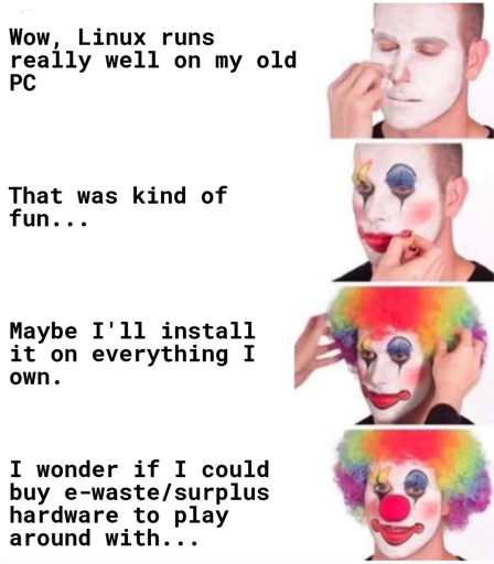 minus-squareLeFantome@programming.devlinkfedilinkarrow-up4·26 days agoI have a laptop that I use regularly that I actually found at the recycle center when I dropped off some bottles. It is running Linux of course.