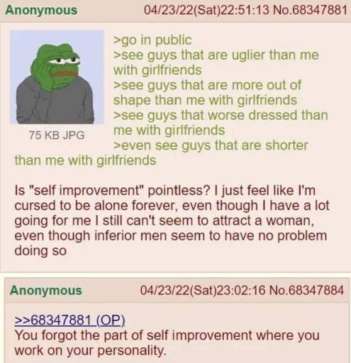 The problem with 4 chan and most online forums is that the hormone levels behind the keyboard are through the roof and they just want sex. They don’t care about actually fixing or changing themselves - they want to do the minimum required to get laid.