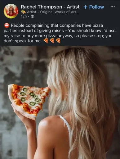 Is she picking her nose with that pizza?