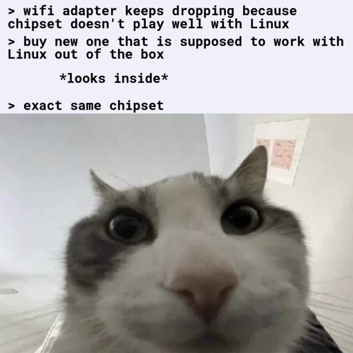 minus-squarePossibly linux@lemmy.ziplinkfedilinkEnglisharrow-up1·2 months agoI have a USB wifi adapter for that reason